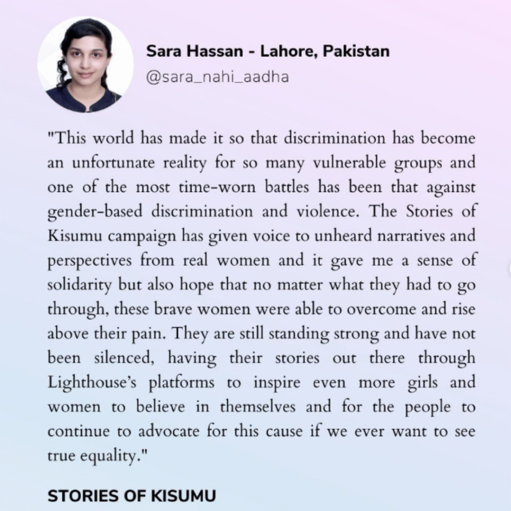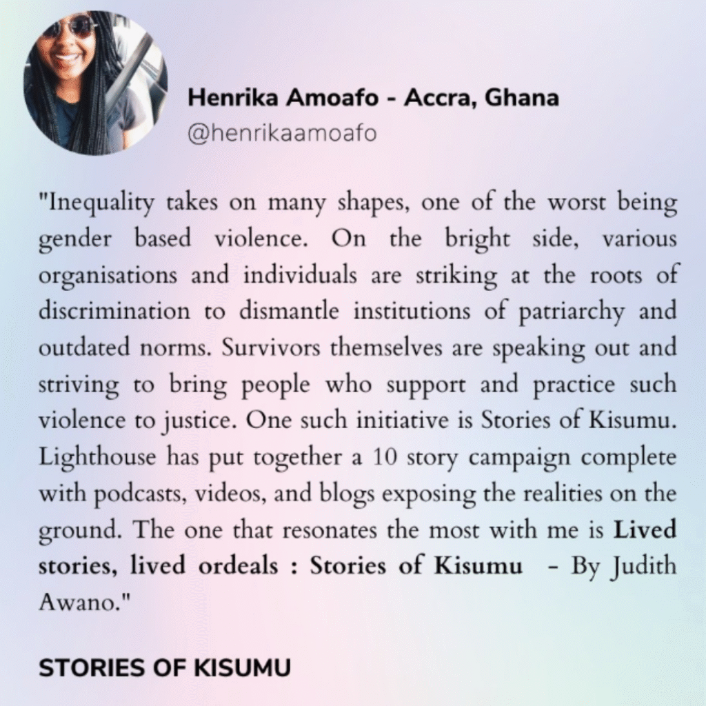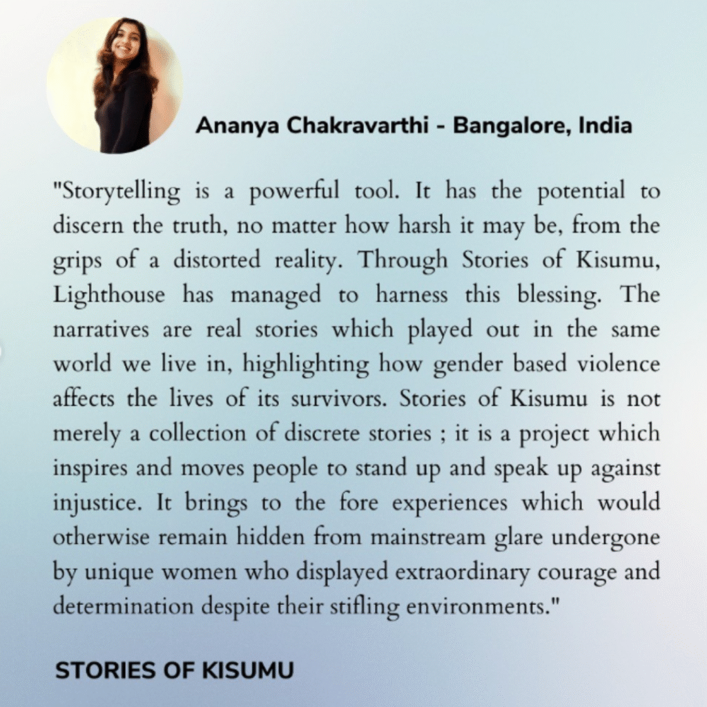 Through ‘Stories of Kisumu’, women and girls living in informal settlements such as Manyatta, Obunga, and Nyalenda, share their voices. We use storytelling forms such as interviews, spoken word, and short films, to actively encourage dialogue among community members and leaders. By centering survivors’ own words and choices, the campaign embodies narrative agency, allowing participants to define how their stories are told and shared. Let us journey back to 2021 and revisit Stories of Kisumu, a project that celebrates the courage, resilience, and determination of women reclaiming their lives in places where silence and stigma often dominate. Amid high rates of day-to-day violence and societal neglect, these women assert their agency through storytelling, and Lighthouse is proud to have provided them with a platform to do so.