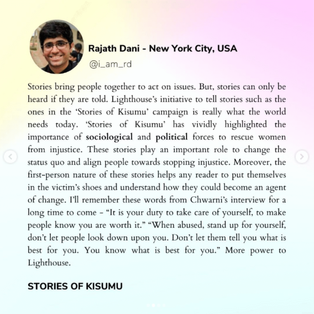 Stories of Kisumu was where Lighthouse truly found its direction. We were documenting experiences of gender-based violence, and we were learning what it means to create a safe, co-owned storytelling space. Working with local journalists, community leaders, and survivors taught us that storytelling, when done ethically, is both an act of healing and of resistance.