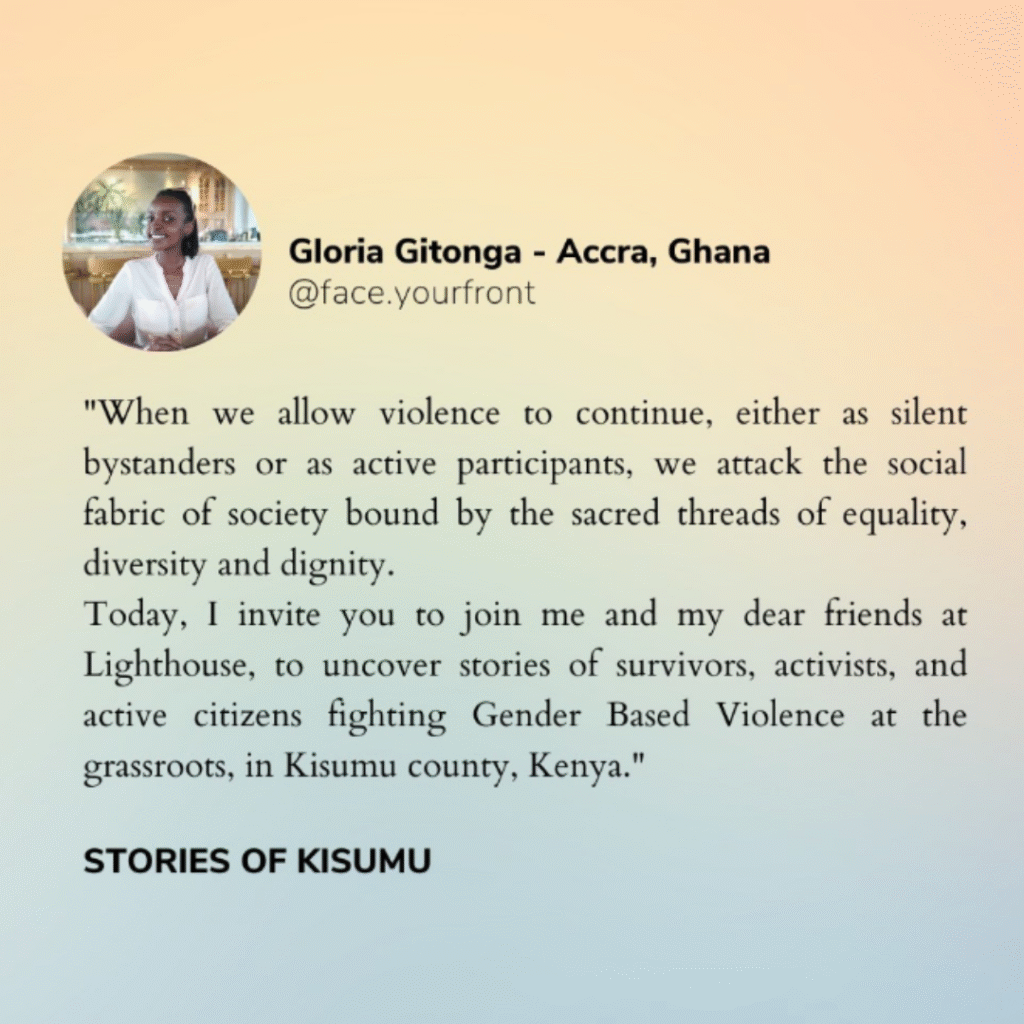 ‘Stories of Kisumu’ is a campaign that shares real experiences of gender-based violence in Kisumu, a vibrant town in western Kenya. The project begins in 2021 when our founder meets a local journalist documenting women’s struggles, and they collaborate to launch a pilot project. This moment marks the birth of Lighthouse and the use of storytelling as a mechanism for change. The campaign takes place at a critical moment: during the COVID-19 pandemic, violence against women increases sharply, and practices such as intimate partner violence, early marriage, and female genital mutilation remain widespread in Kenya. Over 40 percent of women in Kenya aged 15-49 report having experienced physical or sexual violence from an intimate partner during their lifetimes, according to the 2022 Kenya Demographic and Health Survey. In Kisumu slums, a recent study of 398 people aged 18-54 reveals that 76.1 percent report having been subjected to intimate partner violence; emotional abuse stands at 47.5 percent, economic abuse at 23.8 percent, sexual violence at 16.5 percent, and physical violence at 12.2 percent.